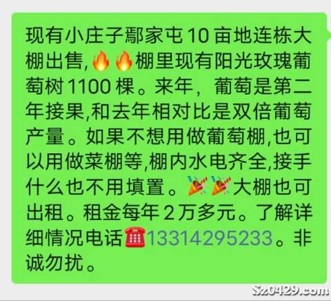 現有小莊子鄢家屯10畝地連棟大棚出售,????棚里現有陽光玫瑰葡萄樹1100棵。來年,葡萄是第二年接果,和去年相對比是雙倍葡萄產量。如果不想用做葡萄棚,也可以用做菜棚等,棚內水電齊全,接手什么也不用填置。[慶祝][慶祝]大棚也可出租。租金每年2萬多元。了解詳細情況電話 非誠勿擾。