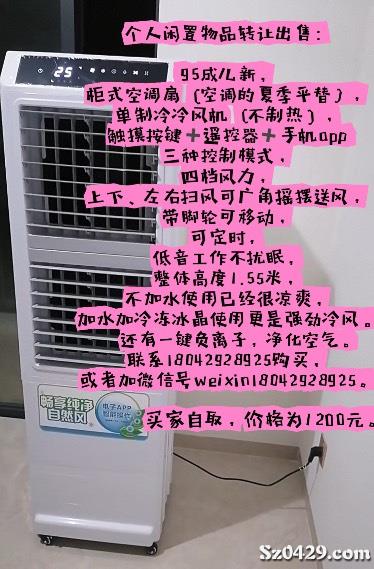 4、95成兒新,柜式可移動空調扇,單制冷冷風機(不能取暖),觸摸按鍵、遙控器、手機app三種控制模式,四檔風力,上下左右掃風可廣角搖擺送風,帶腳輪可移動,可定時,還有一鍵負離子凈化空氣,低分貝工作不擾眠,整體高度1.55米,不加水使用已經很涼爽,加水加冷凍冰晶使用更是強勁冷風,適合家庭、辦公室、商超門店、飯店、倉庫等使用,自取,1200元。
