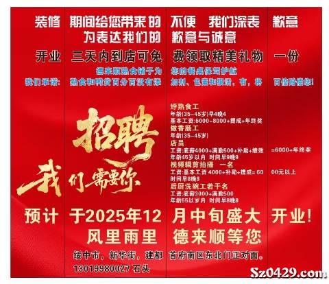 德來(lái)順熟食鋪?zhàn)?br />招聘廚房,烀熟食工,大工,小工;
